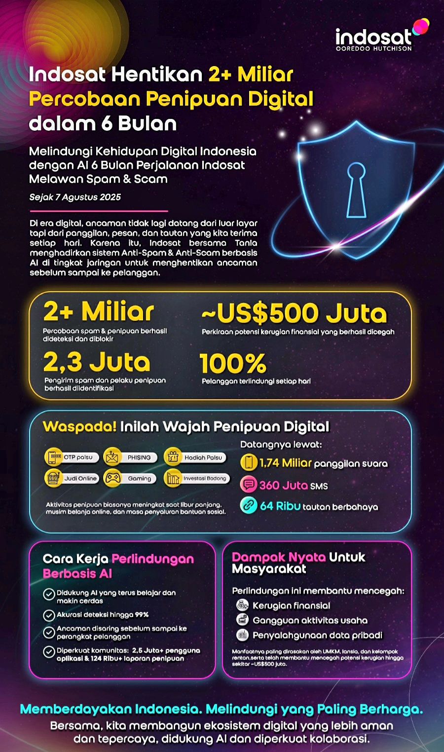 Seluruh fitur ini dirancang inklusif, ringan digunakan dan mudah diakses seluruh lapisan masyarakat. Dukungan teknologi AI, kolaborasi strategis bersama Tanla, serta partisipasi aktif pelanggan, Indosat menegaskan komitmennya membangun ekosistem digital yang aman, tepercaya dan berdampak nyata bagi kehidupan sehari-hari masyarakat Indonesia.