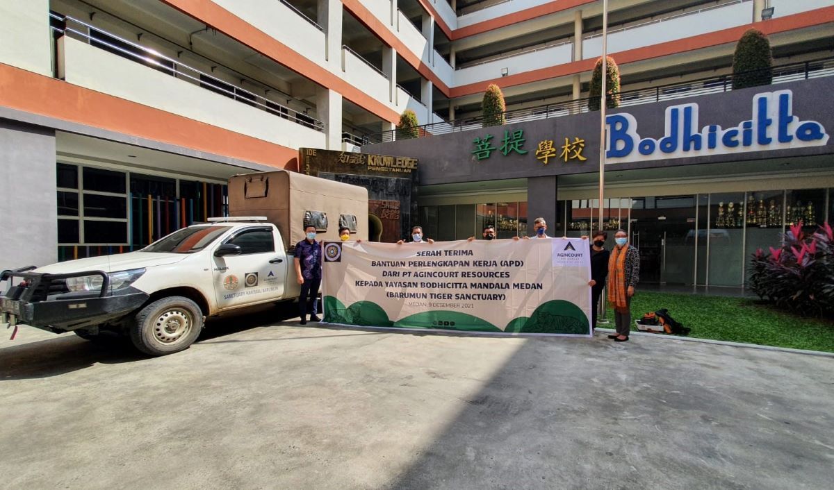 MEDAN - PT Agincourt Resources (PTAR), pengelola Tambang Emas Martabe terus berupaya mendukung konservasi alam, salah satunya dengan memberikan bantuan perlengkapan keamanan bekerja seperti sepatu lapangan, ransel dan jas hujan berstandar tinggi untuk karyawan Barumun Tiger Sanctuary (BTS) yang dikelola Yayasan Persamuhan Bodhicitta Mandala Medan (YPBMM). Penyerahan dilakukan langsung pada Kamis (9/12/2021) oleh Direktur Hubungan Eksternal PTAR Sanny Tjan kepada Ketua Umum YPBMM Eddy, disaksikan langsung oleh Kepala Sub Bagian Data Evlap dan Kehumasan Balai Besar Konservasi Sumber Daya Alam (BBKSDA) Sumatera Utara, Andoko Hidayat.